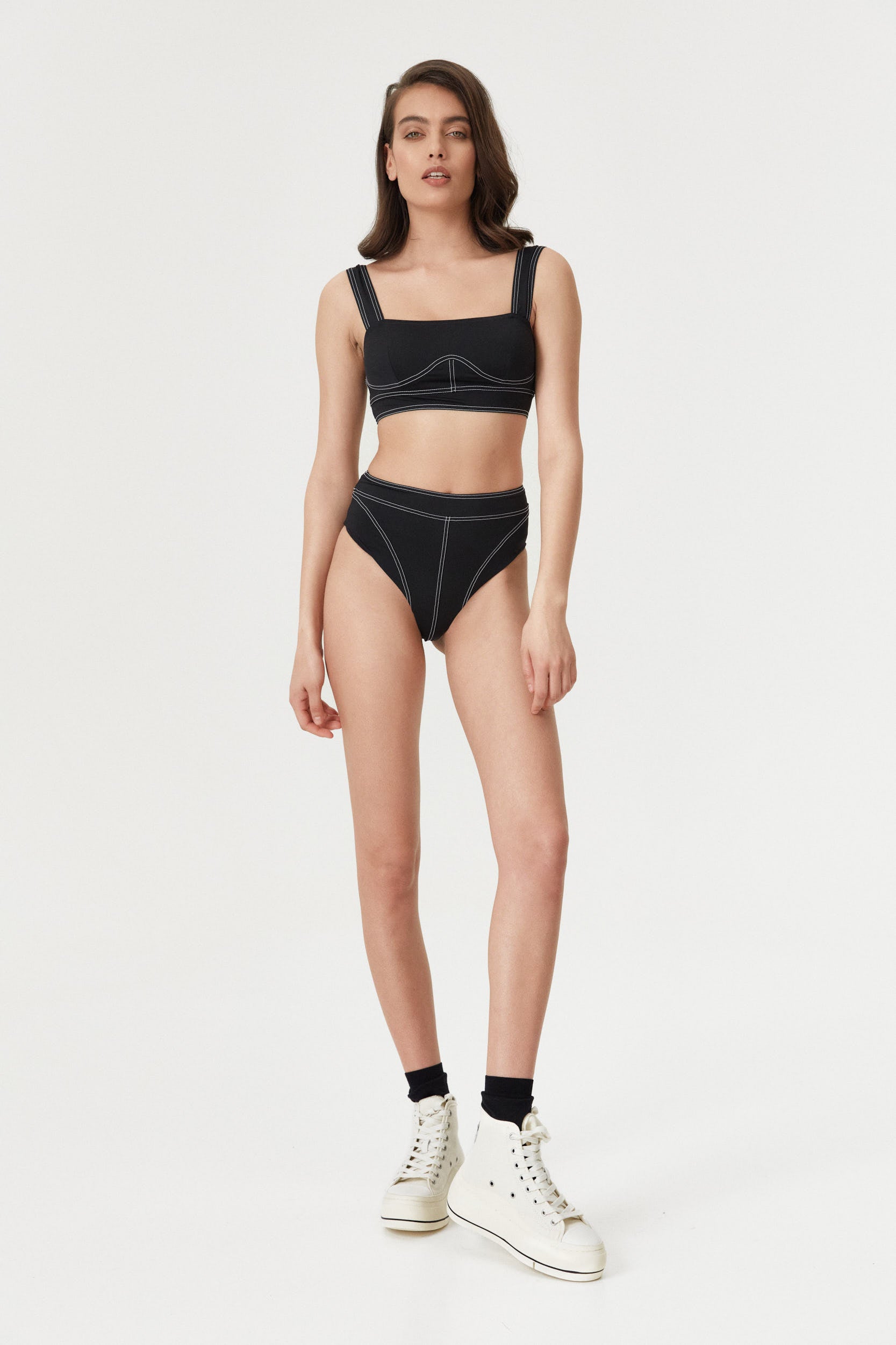 Effortlessly accentuate your curves with our Black Corset Lines High Waist Bottom. The matt black fabric and contrast white stitching create a sophisticated look, while the high waist design and Brazilian coverage provide a comfortable and flattering fit. Look and feel confident on your next beach day.