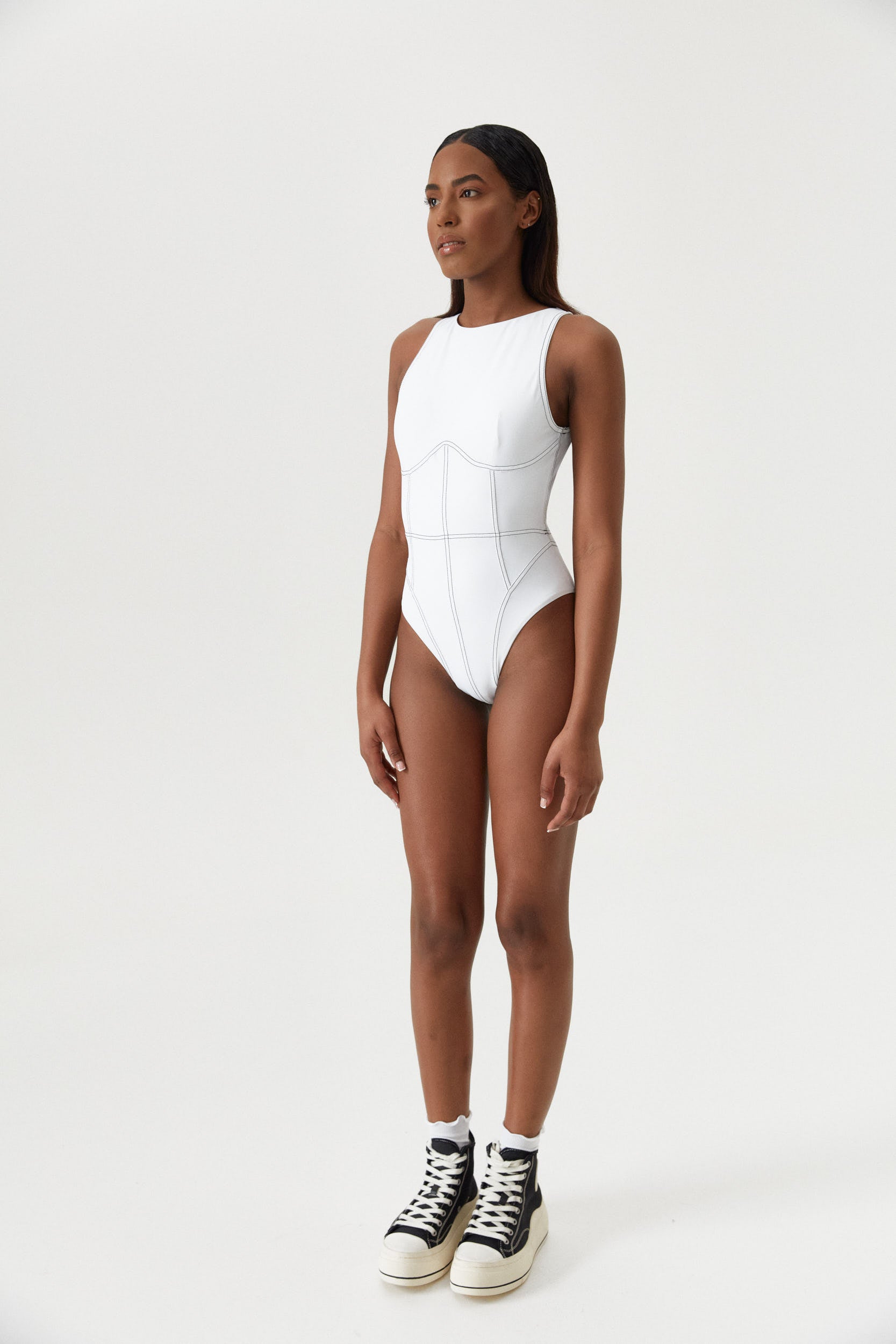 Expertly designed, this white corset features a halter neck and contrast stitching for a unique corset-inspired look. With an alluring open back and Brazilian bottom coverage, this one piece offers a modern twist on classic lingerie. Crafted for comfort and style, it's perfect for standing out at the beach or pool.